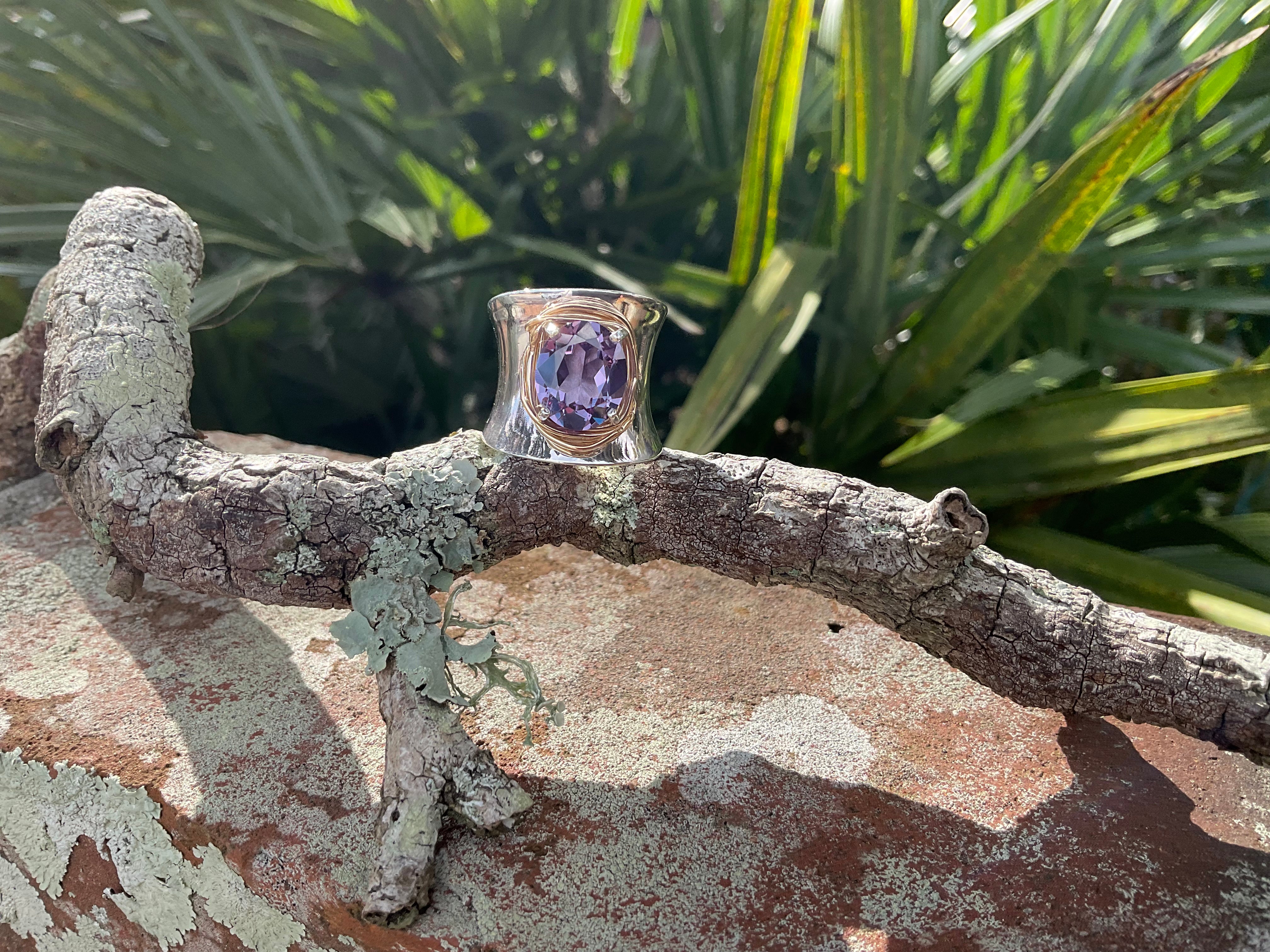Stone size : 12X10mm set on a wide cigar band made of the finest Sterling silver Hand wrapped in 14kGf. Designed and made by Shug.