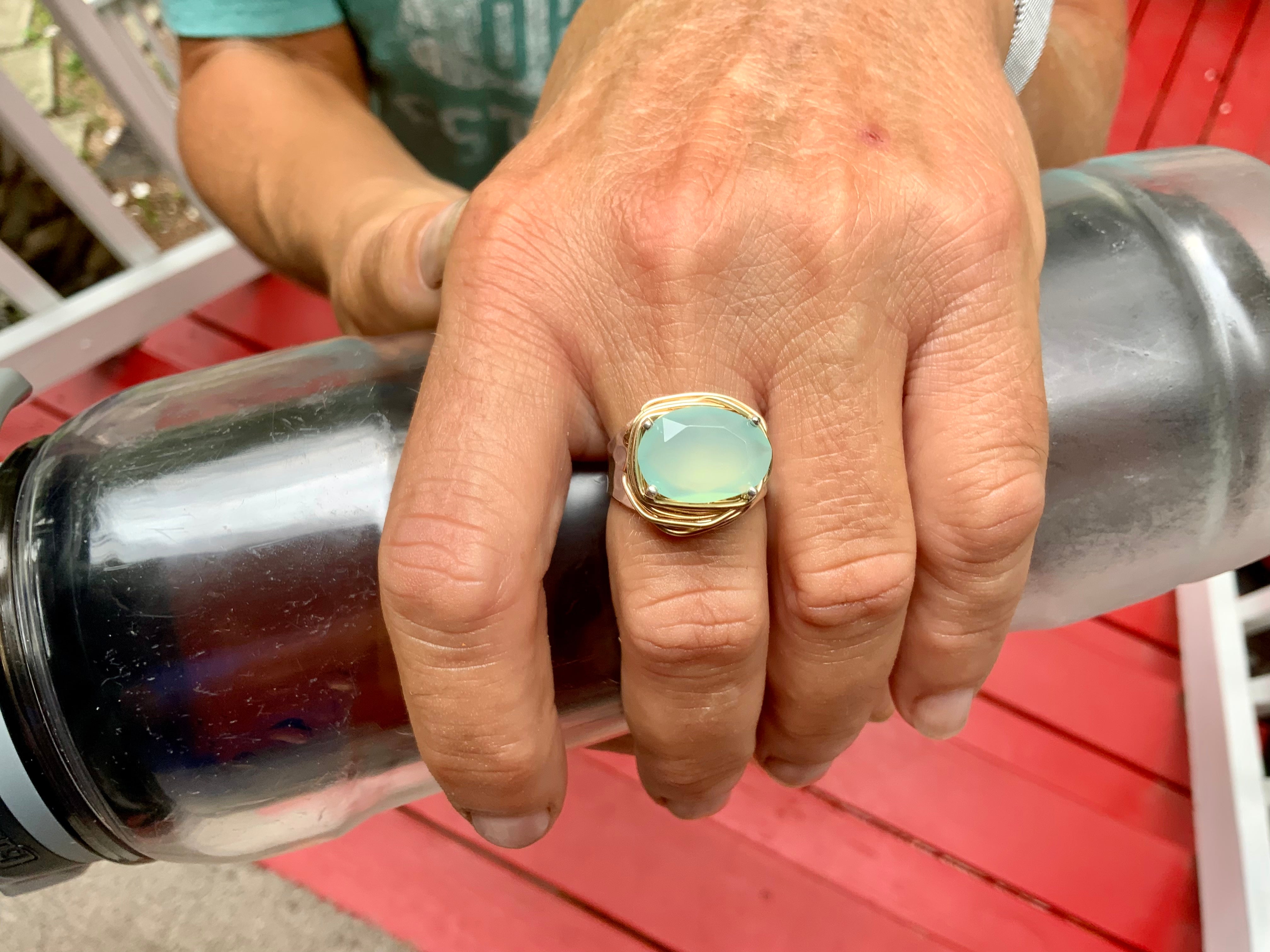 This stunning Aqua Chalcedony Ring is a dreamy blue Semi precious stone and is AAA class at that. A gem stone that will be valued for many generations to come. Handmade and custom designed by Shug. Made with the finest Sterling Silver., with an added hammered textured, wrapped in 14kgf wire.