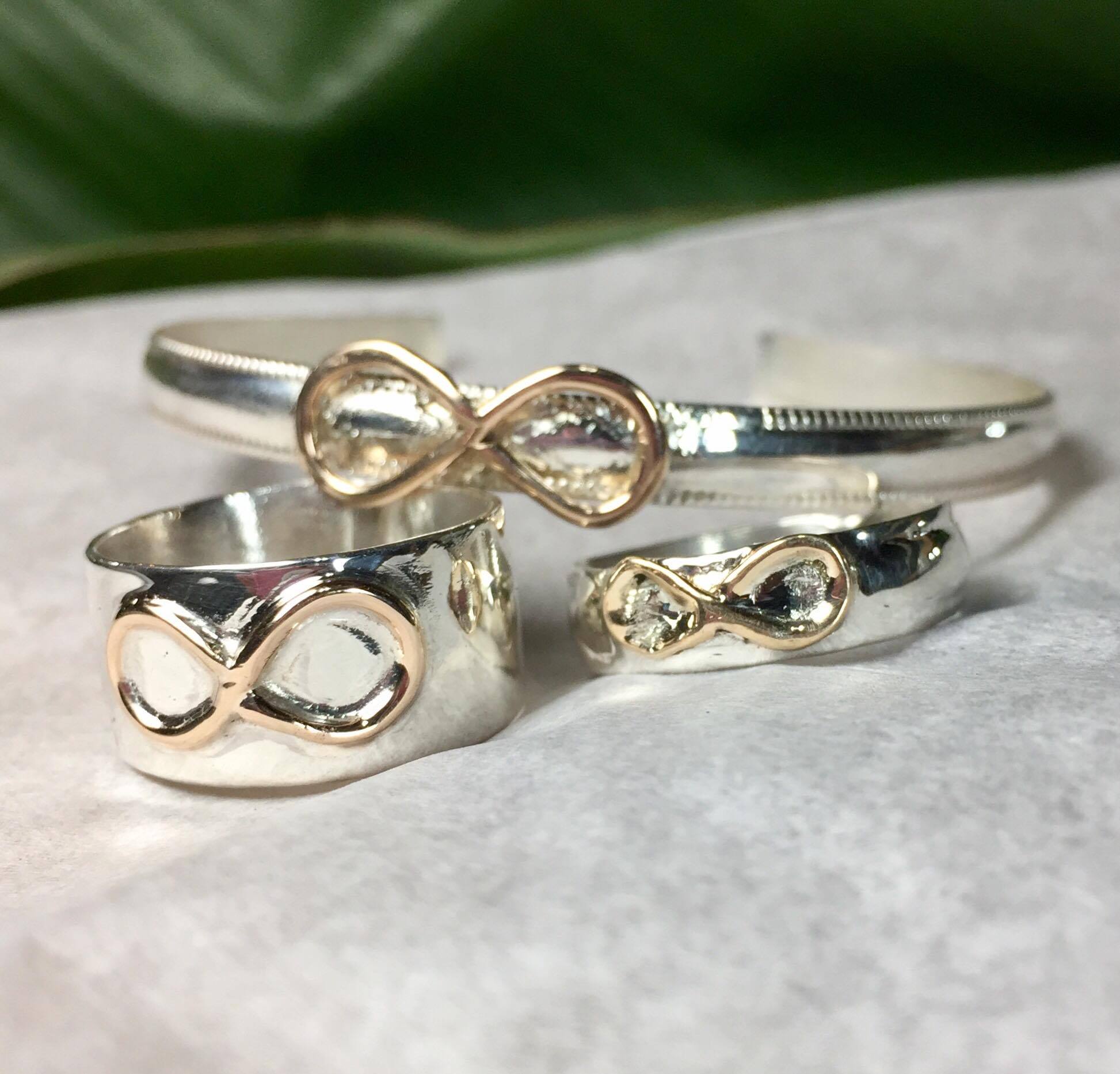 This unisex band is handmade from sterling silver and the infinity is artfully wrapped with 14-kgf.