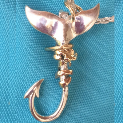 This unique piece is a combination of the whale tail and hook~ custom made by Shug. Accented with 14k gold, the whale tail and hook are solid 925 sterling silver. The necklace comes in a 20 or 24 inch sterling silver German Foxtail chain, imported from Germany.