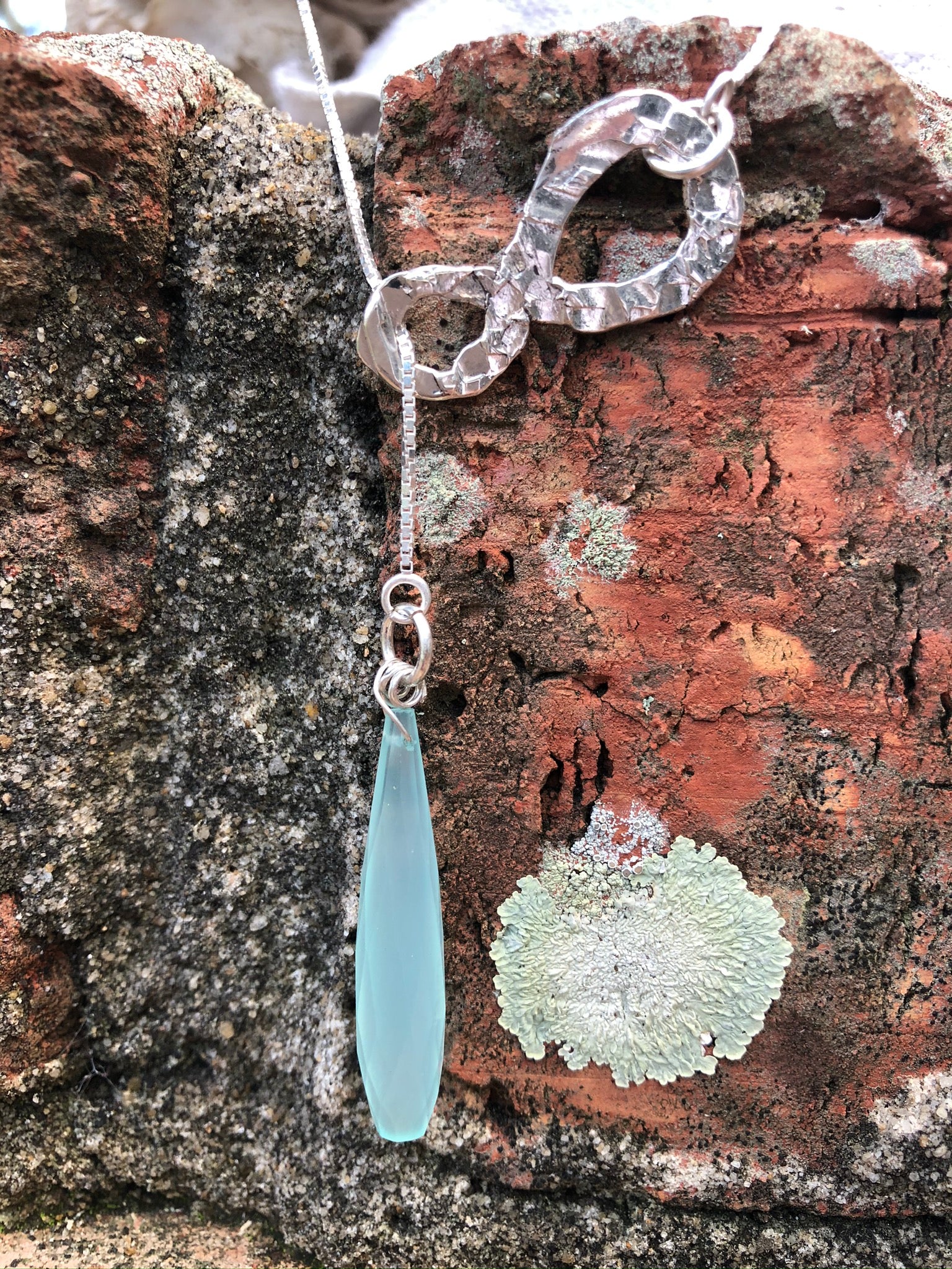 Aqua Chalcedony tear drop stone and Sterling Silver necklace with infinity. The necklace is designed to be adjustable in length.